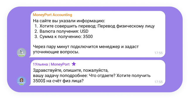 В чате вас ожидают менеджеры, которые зададут уточняющие вопросы и помогут оформить перевод