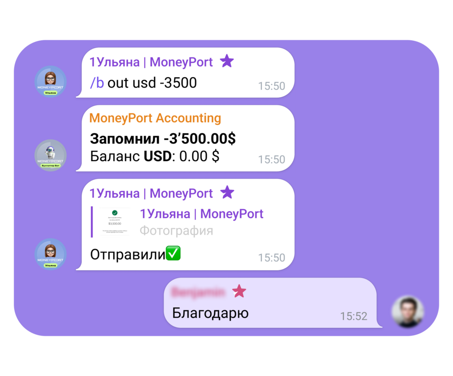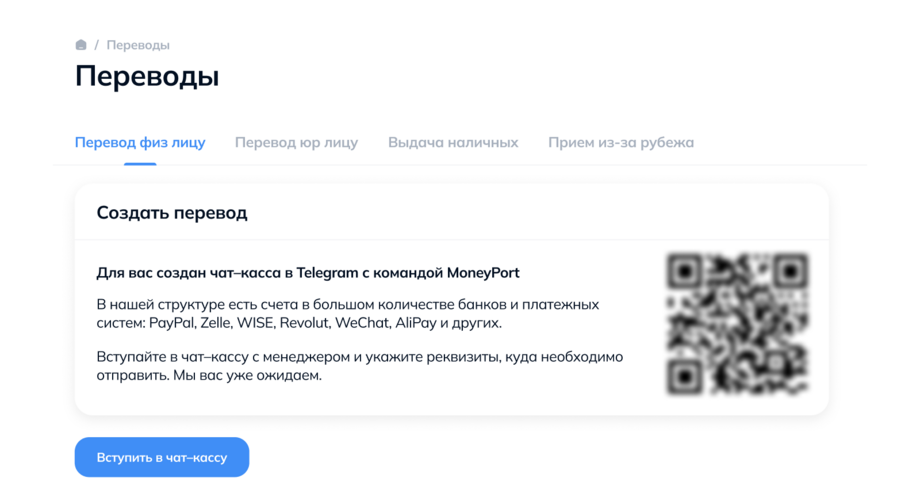 После заполнения необходимой информации, создаётся индивидуальный чат-касса, в котором указаны детали перевода.
